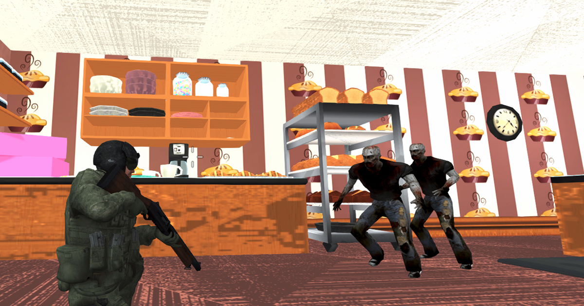 "Bakery Protection" is an exciting online video game that pits players against hordes of hungry, flesh-eating zombies who are intent on devouring everything in sight, including the delicious treats in your bakery! As the player, you are tasked with defending your bakery from these undead attackers, using an array of weapons and defenses to keep them at bay. The game is set in a post-apocalyptic world where a virus has turned most of the population into zombies. As the last surviving baker in the city, it's up to you to protect your bakery at all costs. With each wave of zombies that comes your way, you must use your skills and strategic thinking to build and upgrade your defenses, set traps, and unleash powerful attacks to keep the zombies at bay. The game features a variety of different levels, each with its own unique challenges and zombie types. As you progress through the levels, you will encounter tougher and more dangerous zombies, including giant bosses that will require all your skills to defeat. With its addictive gameplay, fast-paced action, and satisfying zombie-smashing mechanics, "Protect the Bakery from Zombies" is a game that will keep you coming back for more. So grab your weapons, stock up on supplies, and get ready to defend your bakery from the zombie apocalypse!WASD - Move. LMB - Shoot. RMB - Aim. Mouse Wheel - Change weapon. R - Reload. Space - Jump. TAB - Pause.