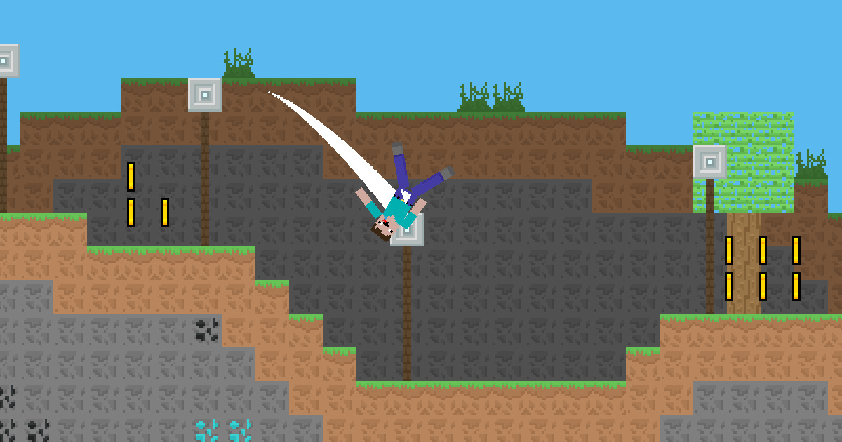 hey noob now you can fly from place to place by throwing a net. Be careful, don't fall on the floor or you will die, very dangerous ground can kill you at any moment. net and jump. Be careful, sharp rotating blades and sharp wooden thorns everywhere you must not touch them. collect the gold on the way and have the most gold."Hold and pull then release" to jump.